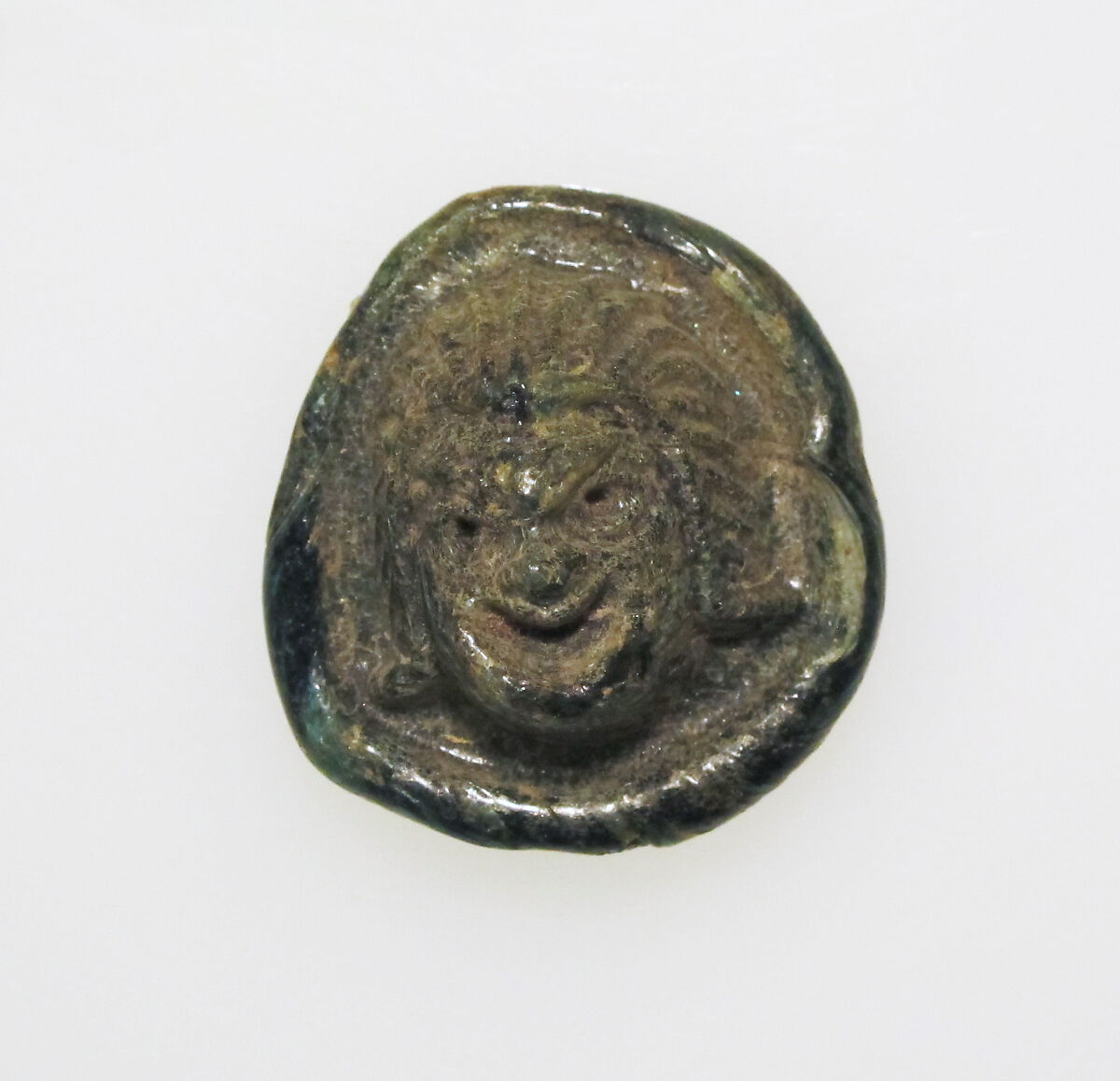 Roughly circular, attached to vessel wall; thick rounded edge; mask in high relief.