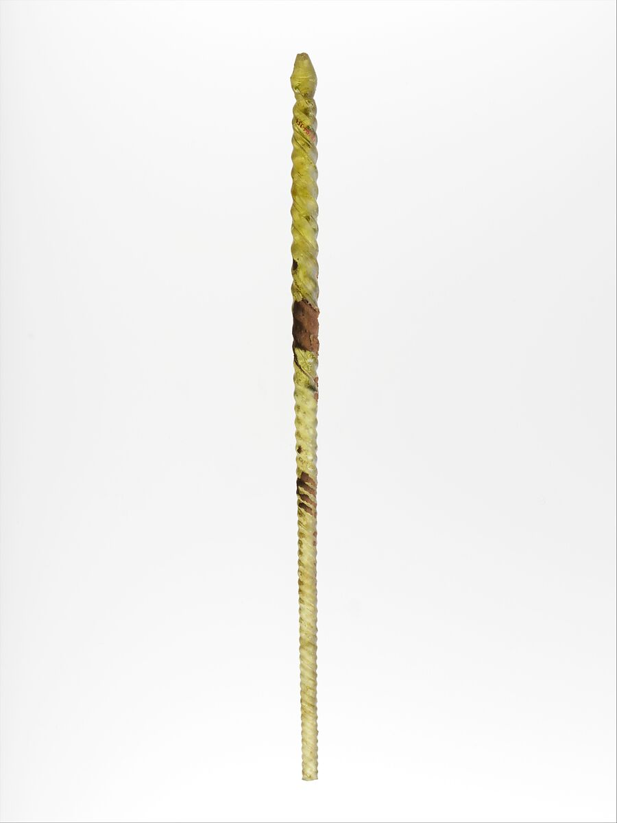 Long rod, spirally twisted, tapering towards one end, and tooled into a biconical knob at the other.