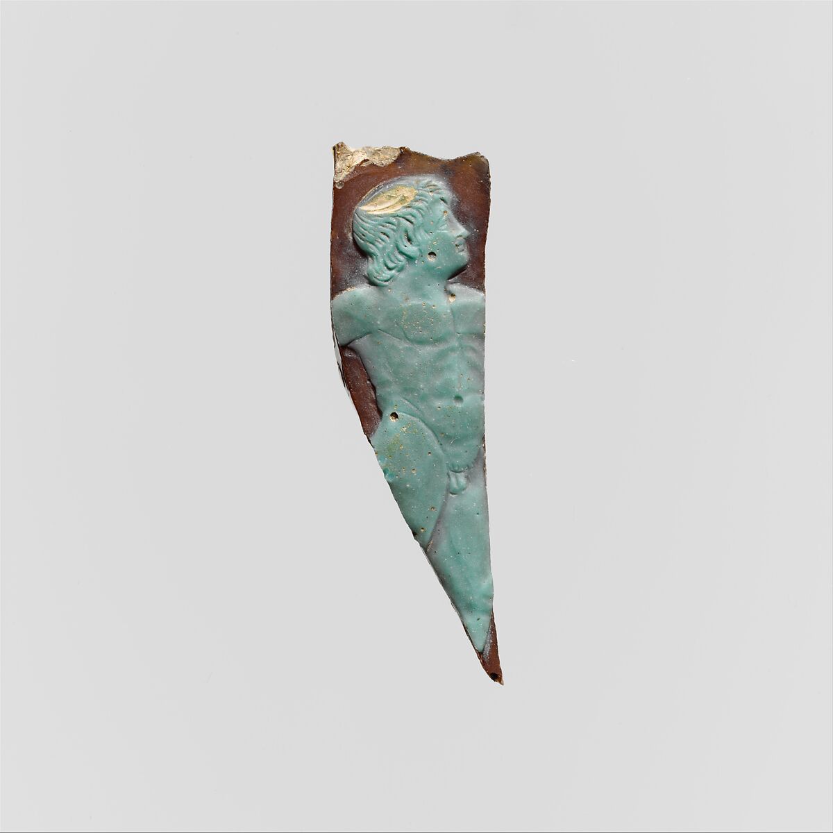 In relief in green, naked youthful satyr, facing right with head in profile, torso and legs in three-quarter view, and proper right arm raised behind him; torso rendered with musculature in fine detail; on his head, above his pointed proper right ear, is what appears to be a leaf or wing, picked out by differential weathering.