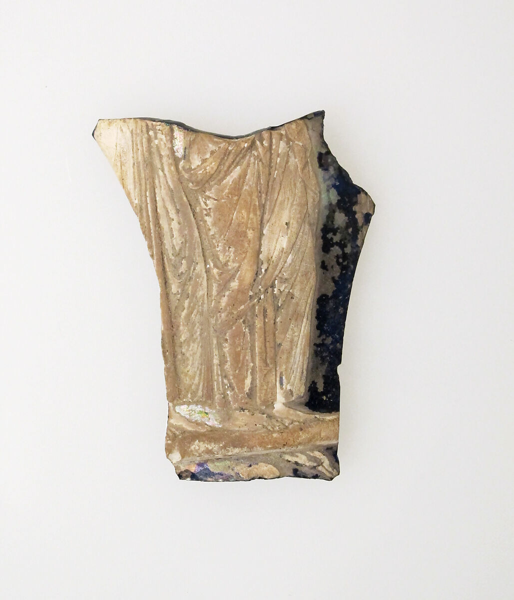In relief in white, lower part of two draped standing figures with bare feet, facing right; both with proper left leg slightly bent; intricate folds of clothing are carefully carved; below, a raised, slightly uneven, broad ground line; beneath, a second register of decoration, of which only the tips of two leafy sprays or branches are visible.