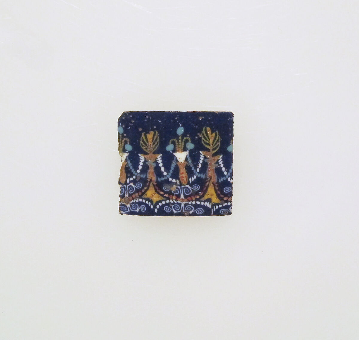 Translucent cobalt blue ground; decoration in opaque white, turquoise blue, yellow, and red.