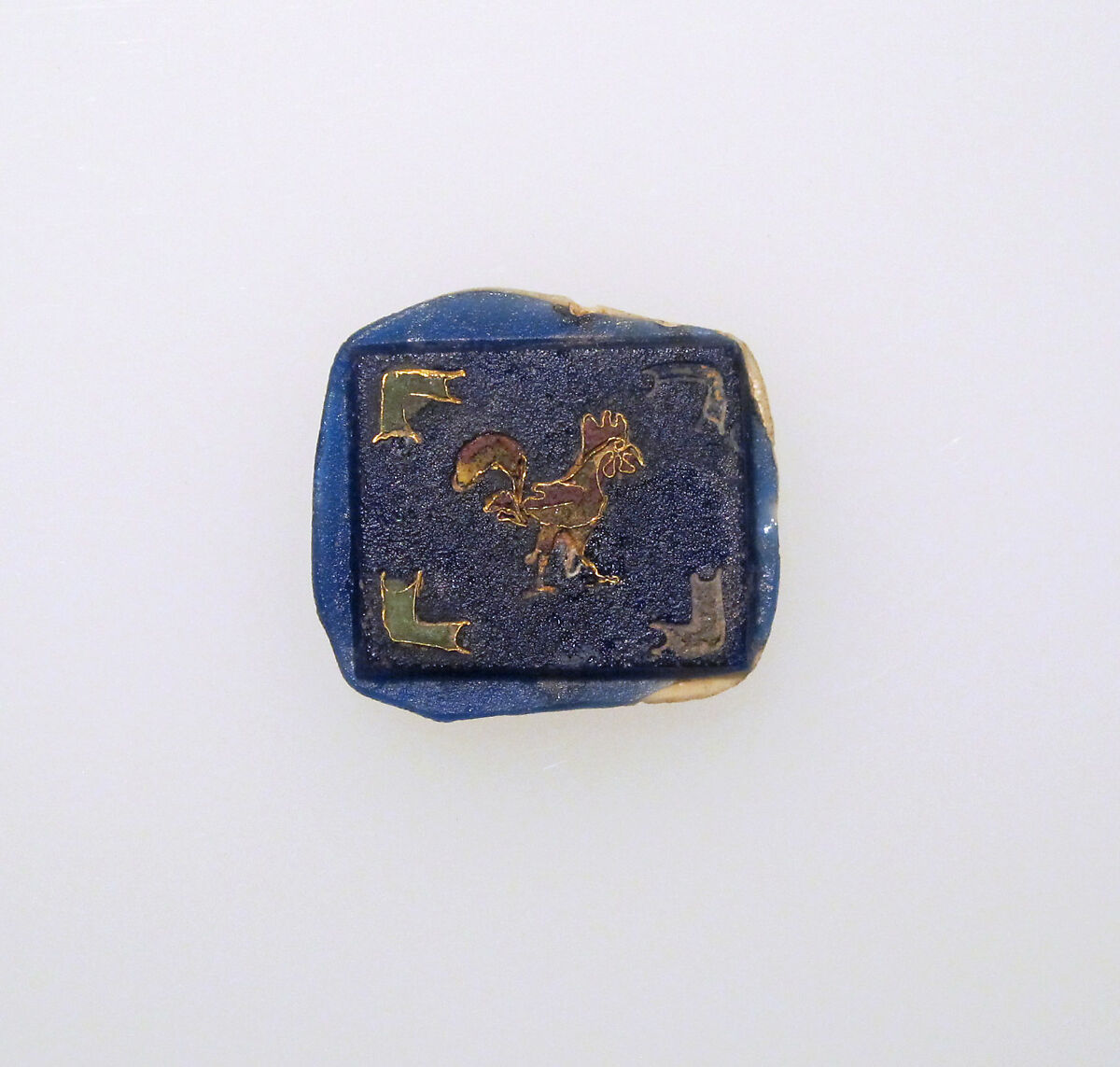 On upper surface, a rooster at center facing right and four small leaf-like motifs, one at each corner; rooster outlined in gold wire and inlaid with small pieces of red and yellow glass; corner motifs outlined in gold wire and inlaid with green glass.