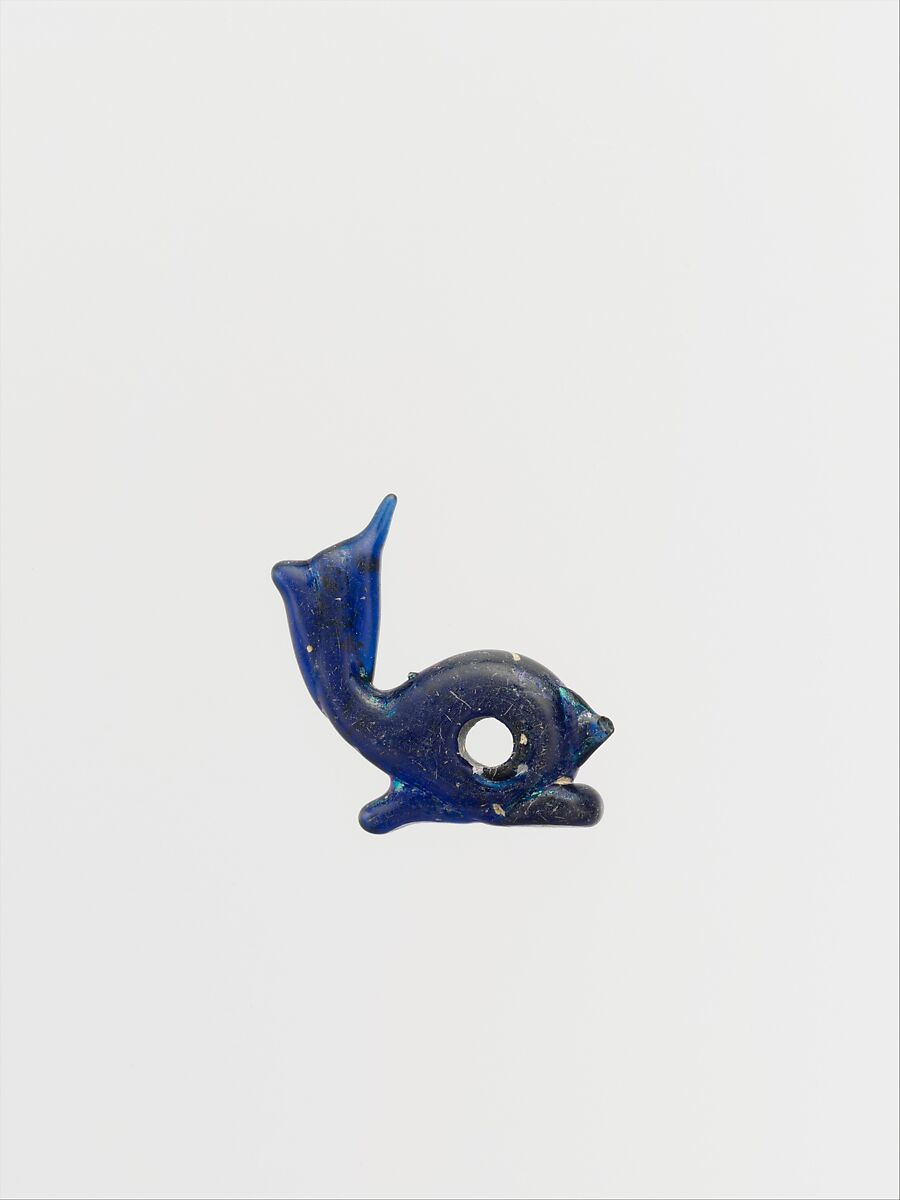 Large hole through circular body, drawn out to form large upright tail with applied fins on either side; other applied fins on lower edge of body and applied nose to head.