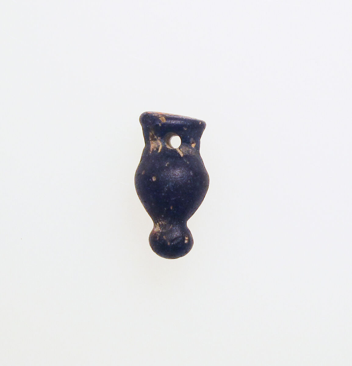 Translucent cobalt blue bead. Everted rim; flat, solid top; concave neck, pierced with horizontal hole; ovoid body tapering downwards; globular base knob. Intact; dulling, pitting, and some iridescent weathering.