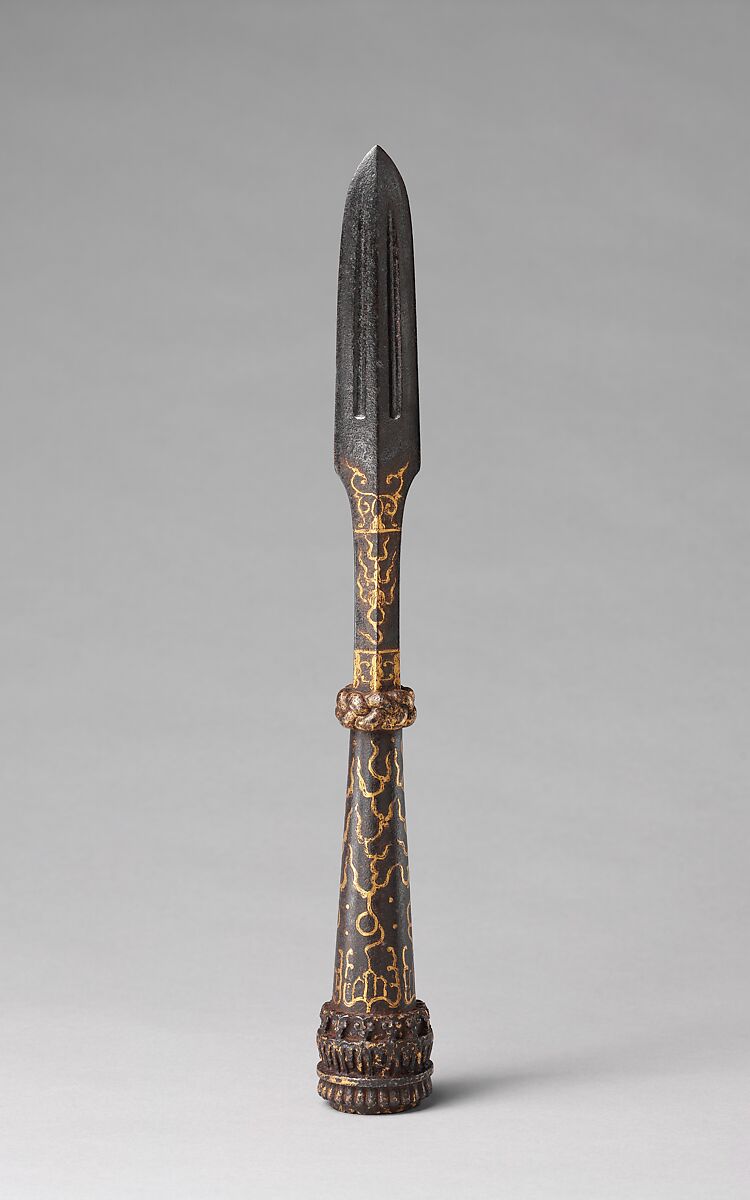 Despite its heavy surface patina, this spearhead is very similar to another example in The Met's collection (acc. no. 2000.206a, b) for the form of its blade and the presence of a realistic braided ring rendered in chiseled steel (here at the midpoint, rather than the base of the socket). At its base there is a collar of stylized lotus petals and a ring of the trefoil-like ruyi motif. The surface above this is damascened in gold with simplified designs of flaming pearls and mountains and waves.