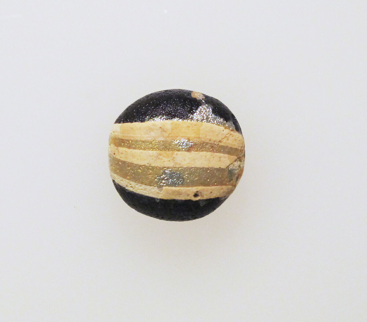 Round black opaque pinhead with three white stripes.