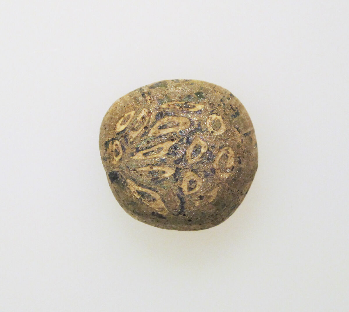 Circular opaque brown and white millefiori pinhead.