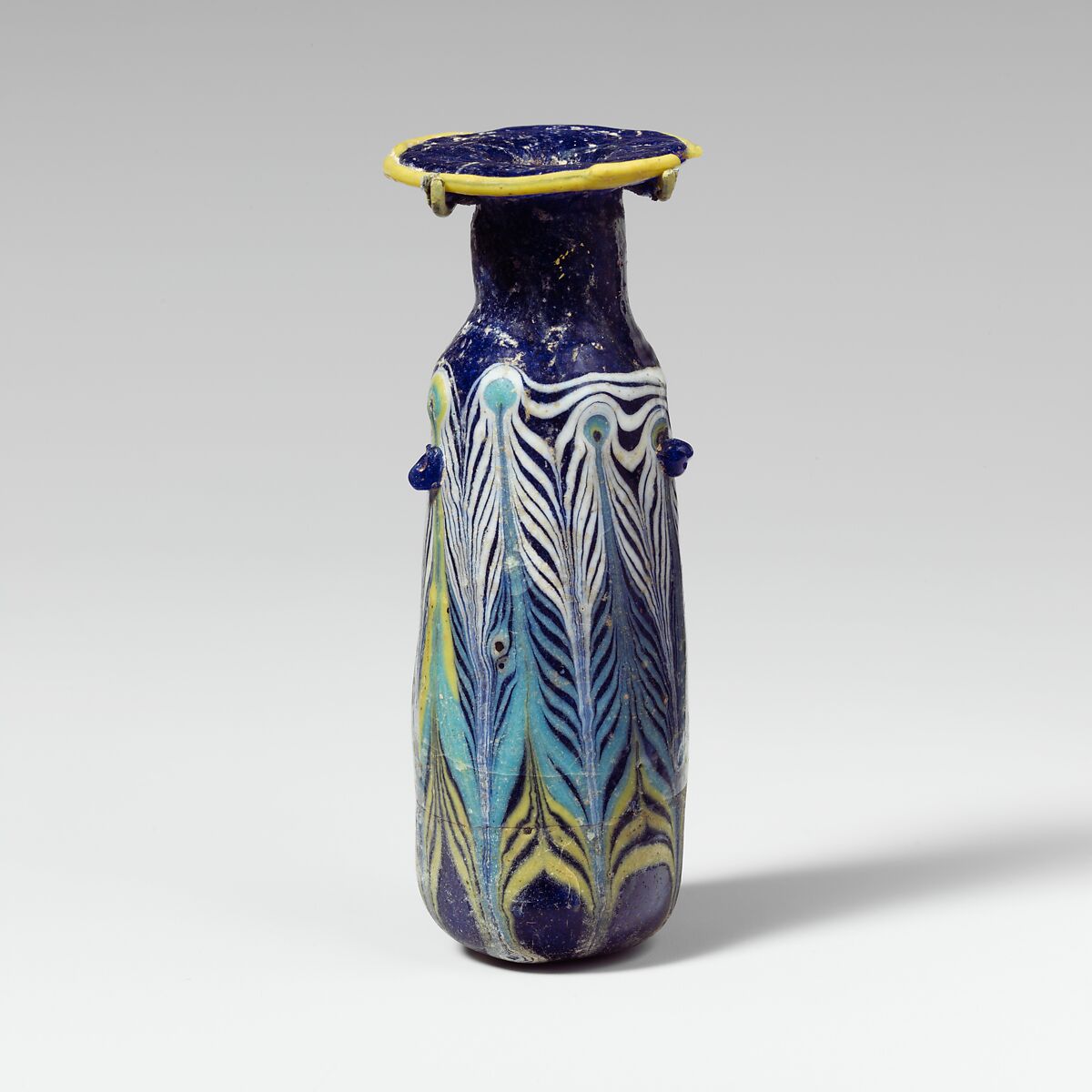 Translucent cobalt blue, with handles in same color; trails in opaque yellow, opaque white, and opaque turquoise blue.