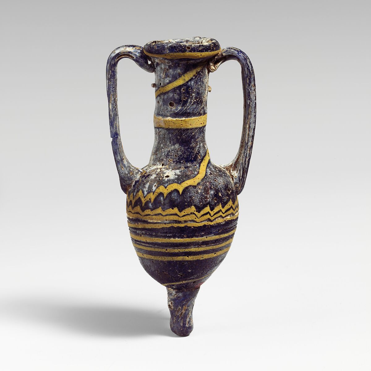 Uneven horizontal rim-disk with rounded edge; tall cylindrical neck; sloping shoulder; small ovoid body; large coiled base-knob applied to pointed bottom; two vertical strap handles applied to top of body in pads, drawn up and slightly outward, then turned in and attached to top of neck and underside of rim-disk.