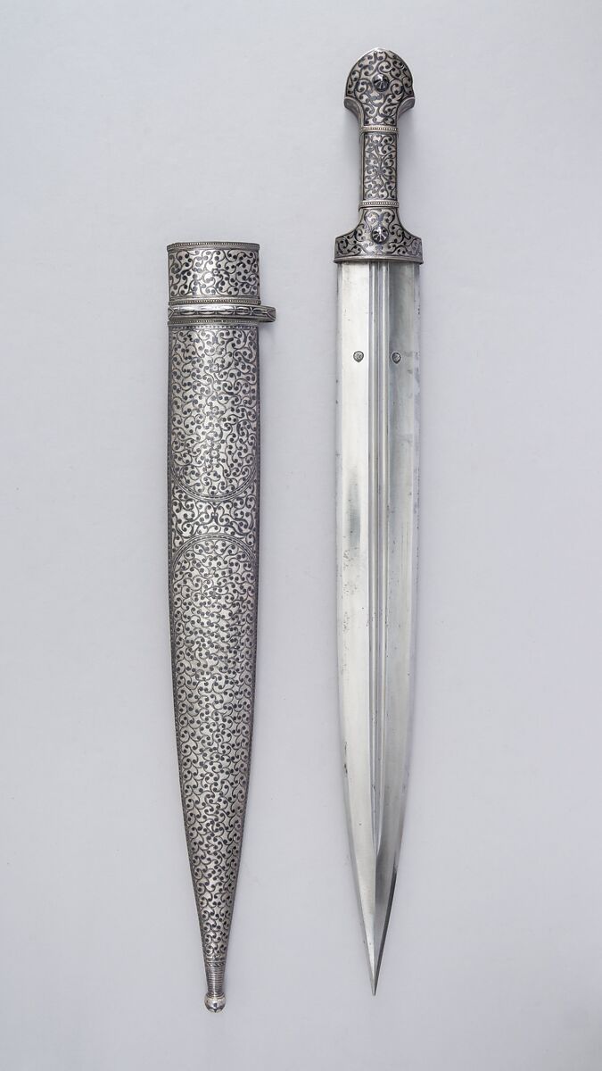 This dagger has two central grooves in its steel blade. The handle and sheath have been decorated in niello, a black substance containing silver, copper, lead, and sulphur, that is a striking contrast to the silver ground. In the Caucasus, daggers such as this one were inseparable companions of Caucasian men and used for a variety of purposes, such as weapons, cork screws, and paper cutters, as well as dance accessories. Nineteenth-century photographs of Caucasian men in native dress frequently include such daggers, which are attached to their belts in a diagonal manner.