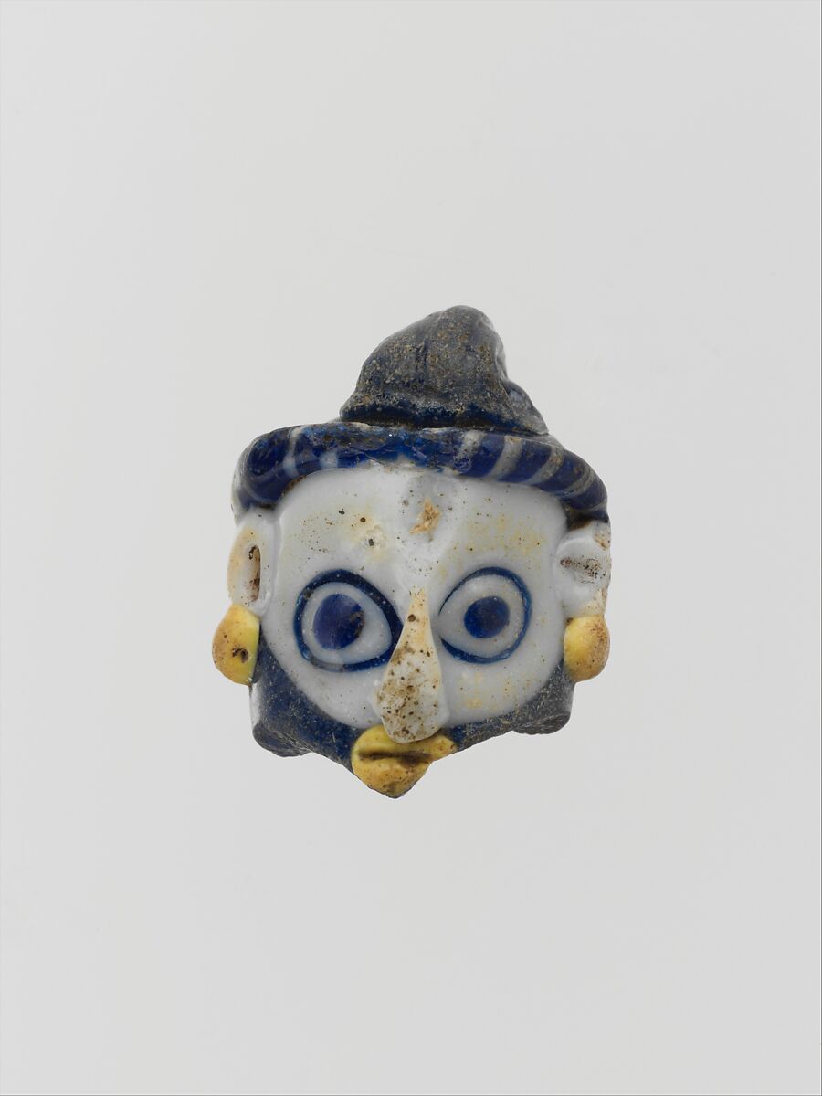 Applied twisted headband in cobalt blue and white; upper half of face in white, with blue and white stratified eyes, white ears, yellow pendant earrings, and white nose; beard in blue with small mouth in yellow.