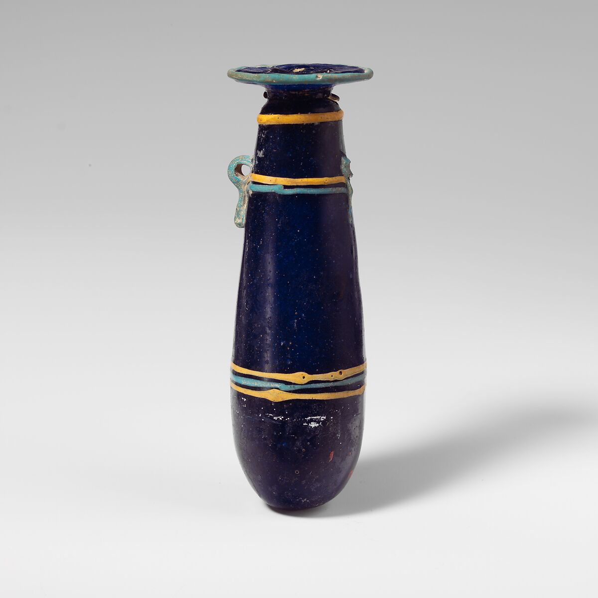 Translucent cobalt blue, with handles in opaque turquoise blue; trails in opaque yellow and opaque turquoise blue.
