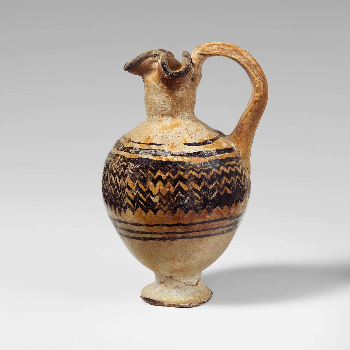 Applied broad trefoil rim-disk; rather tall cylindrical neck, slanting forward; broad sloping shoulder; ovoid body; applied outsplayed foot with uneven concave bottom; handle attached to top of body over trail decoration, drawn up and out, then turned in and pressed on to back of neck below rim.
