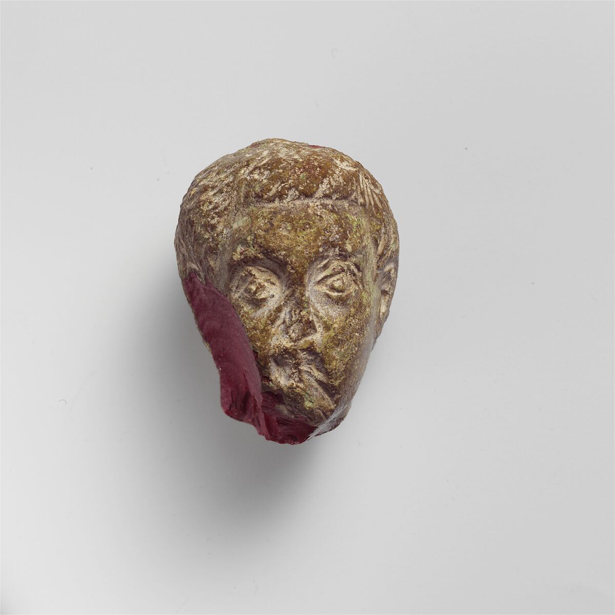 Broken, with large unweathered chip in proper right side of face and side of head, and weathered chips to nose, mouth, and chin; green copper weathering surface.