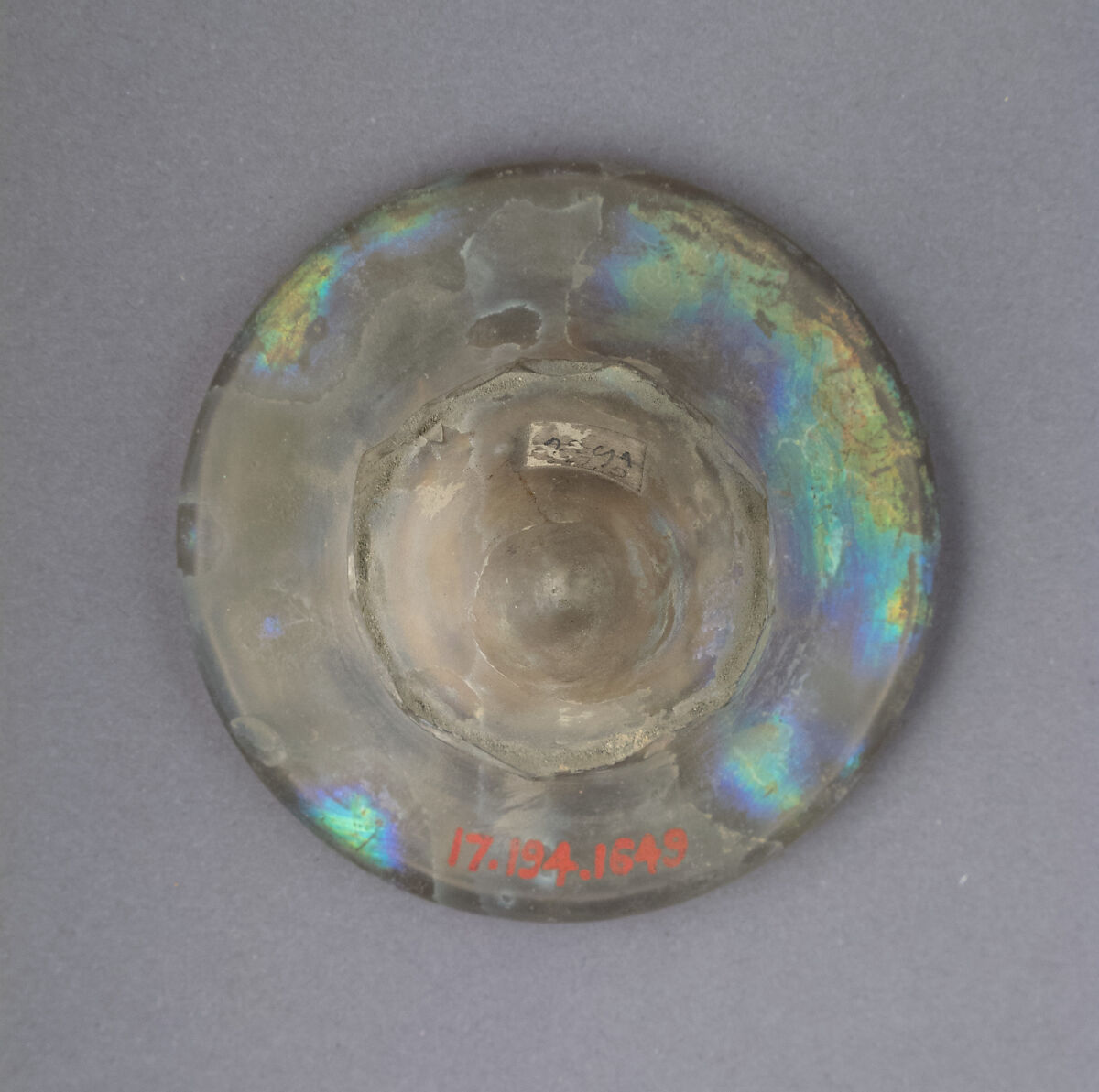 Complete base, broken off from body of vessel; pinprick and a few larger bubbles; dulling and iridescent weathering, with thicker creamy weathering inside kick.