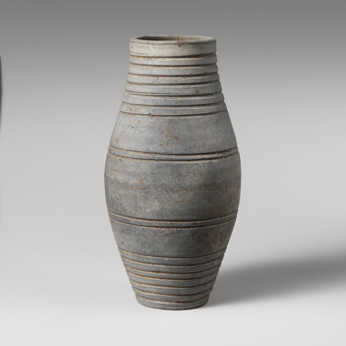 The incised grooves around the body imitate the hoops around a wooden barrel.