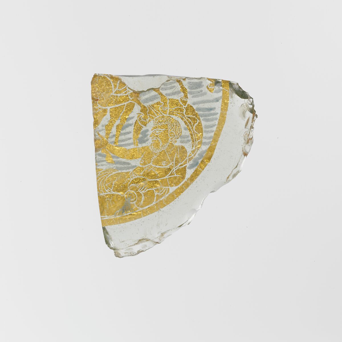 Many examples of gold glass have been found in Rome, where they were eventually used to decorate the catacombs. They often have Christian scenes. This fragment from the base of a bowl, however, depicts the figure of the Roman deity Oceanus reclining in the sea, which is indicated by wavy lines in pale blue pigment. He holds a jar from which water pours, and above him are the legs of horses that probably pull a chariot over the waves.
