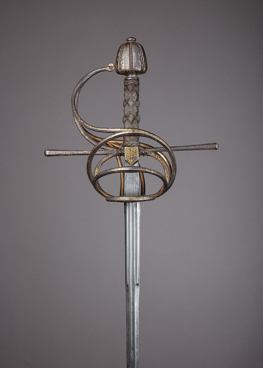The rapier was the principal civilian sidearm throughout the sixteenth and seventeenth centuries. Designed for cut-and-thrust fencing of progressively complex techniques, the rapier is characterized by a double-edged blade with an acute point and an elaborate guard for the hand. The guards, usually of iron or steel, were subject to a variety of embellishment. They were engraved, chiseled, gilded, damascened, and encrusted in gold and silver in keeping with fashionable styles.