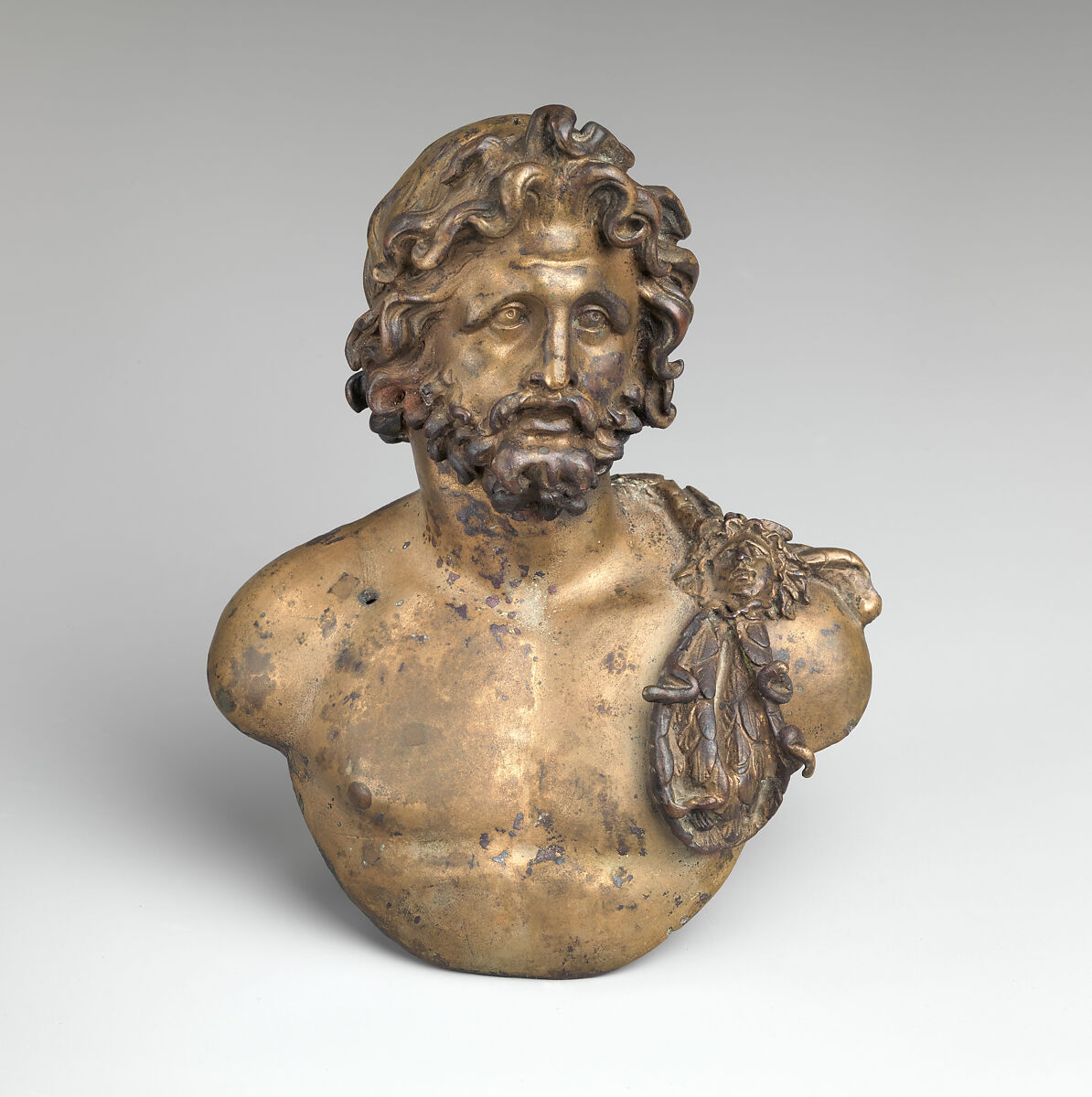 The bust likely served as an emblema (centerpiece) of a bowl. Jupiter wears an aegis with gorgoneion over his left shoulder. The right nipple is inlaid with copper.