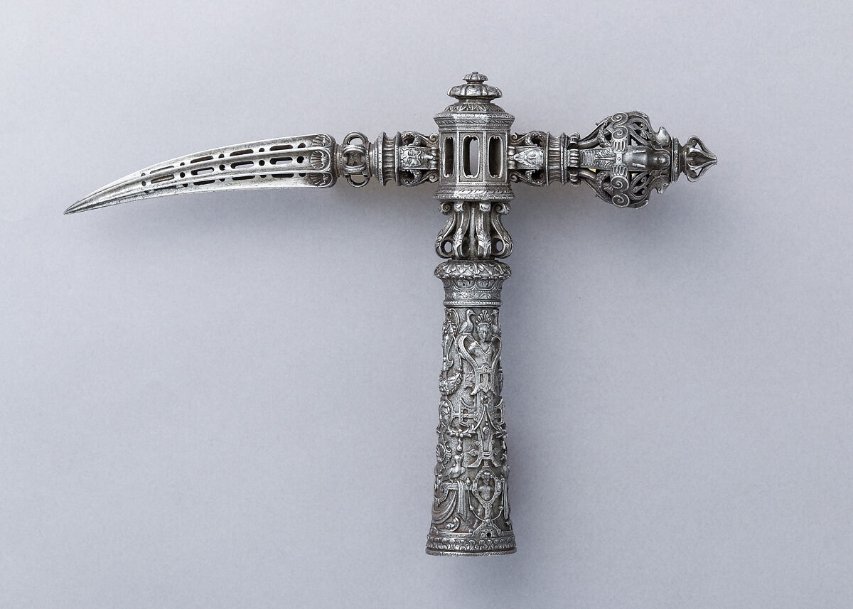 War hammers were carried as a sidearm by armored cavalrymen for much of the sixteenth century and generally have a hammer-like head opposite a spike or beak: one designed to strike a concussive blow, much like a mace, and the other to pierce or puncture. This example, although entirely of steel, is a ceremonial or symbolic weapon, distinguished by its extensive and exceptionally fine chiseled decoration.