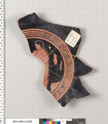 Compared with symposium scenes of the preceding generation of cup painters, this work presents a more complex viewpoint. The symposiast is seen from the back, and the attending woman is on the far side of the kline (couch). She holds a phiale (libation bowl).