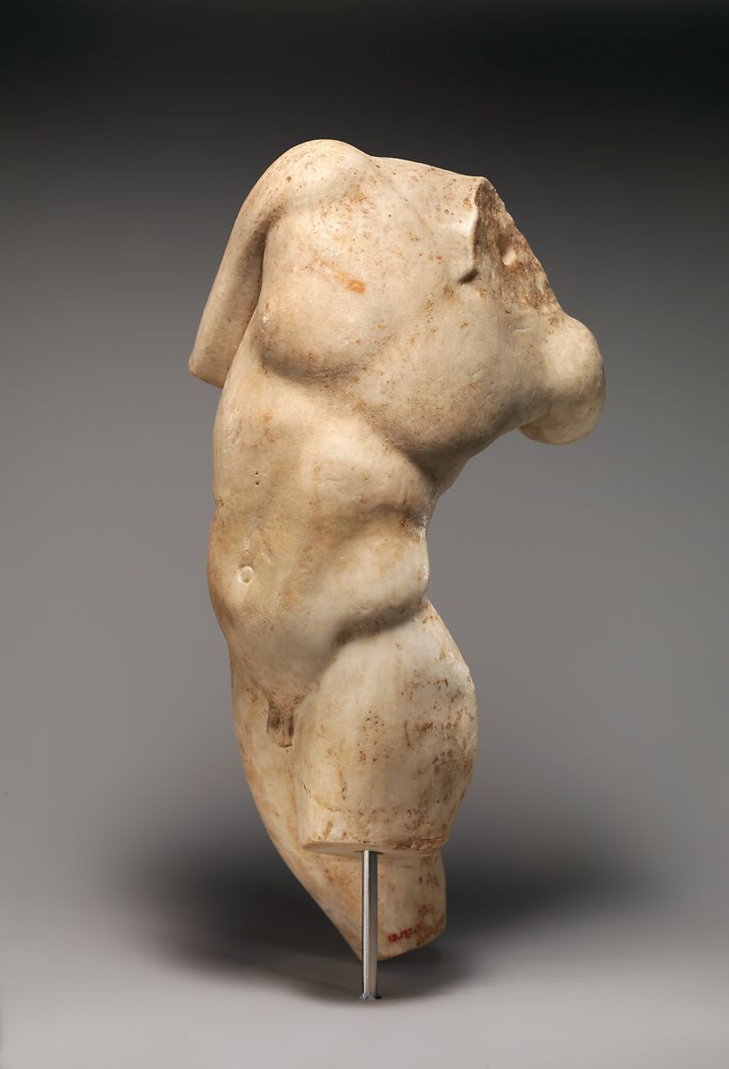 Statues of satyrs, relaxing, dancing, pursuing nymphs, or, as here, admiring themselves proliferated during the third century B.C., as the cult of Dionysus, god of wine and the pleasures it bestows, grew in importance. Such works were both copied and adapted by the Romans to decorate their villa gardens.