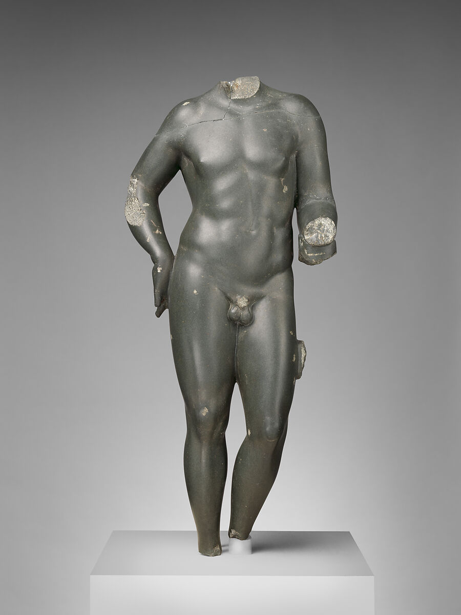 The Romans used colored stone on floors, as wall revetment, and in sculpture. This plump young boy originally appeared in a relaxed pose, with his left arm resting on a support. The statue was carved with consummate skill in one of the hardest stones.