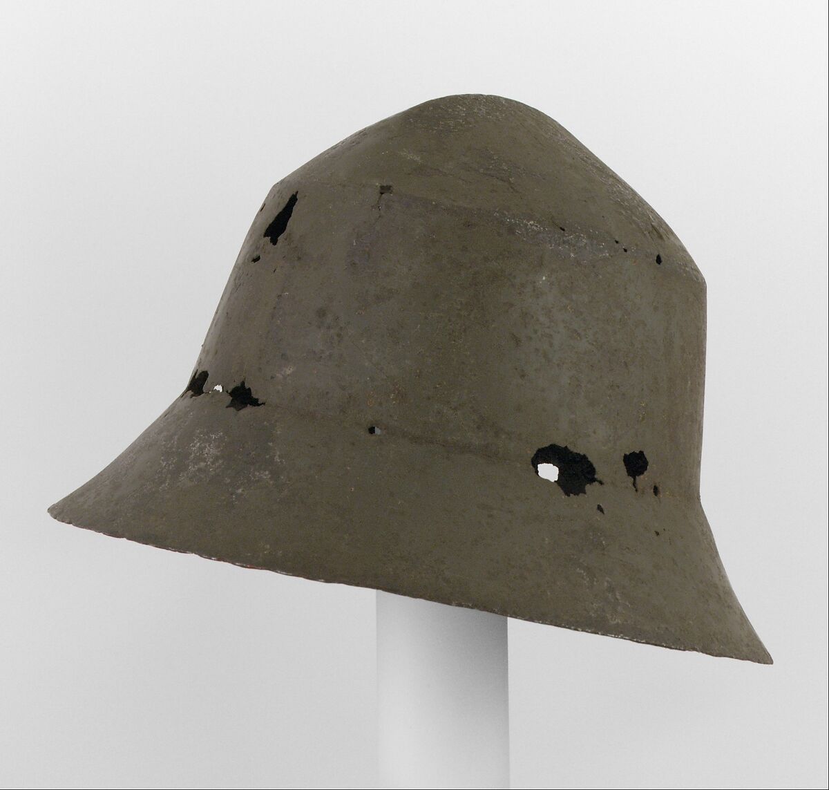 Said to have been found in Lake Morat, Switzerland, this helmet traditionally has been considered Swiss and of mid-fifteenth-century date. However, the presence of similarly large, deep helmets of this general type in fourteenth- and early-fifteenth-century Italian paintings suggests that both the attribution and date are subject to further review. The steel surface retains traces of its original tinning, an early form of rustproofing.