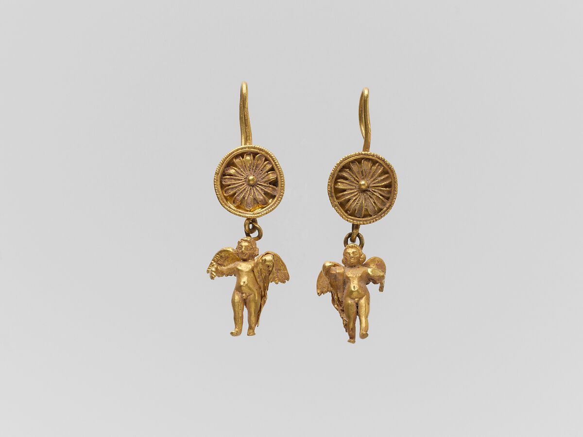 - Title: Pair of gold disk earrings with pendant Erotes