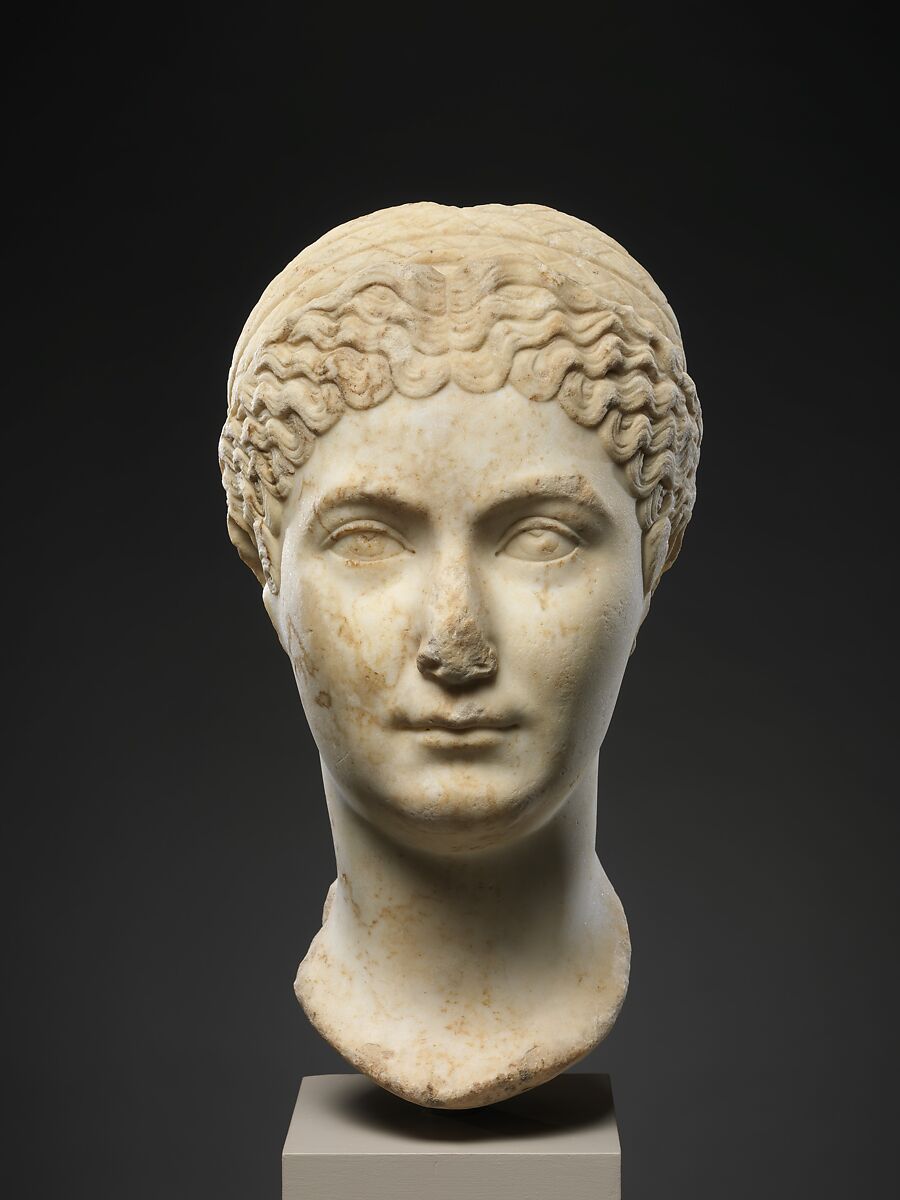 This head originally belonged to an honorary portrait statue of Mindia Matidia, or Matidia Minor (A.D. 85–162), half-sister of Sabina, wife of the emperor Hadrian, and aunt of the emperor Antoninus Pius. There exist five other replicas of this portrait type, recognized by a recently discovered statue of Matidia Minor from the Roman theater at Suessa Aurunca, a Campanian town of which she was a major benefactor. As is common with members of the imperial family, she is portrayed with an idealized, youthful face, and styling a complex coiffure that includes a hairpiece in the shape of braids coiled on top of her head. Her upward gaze is characteristic of many portraits from the Antonine period onward.
