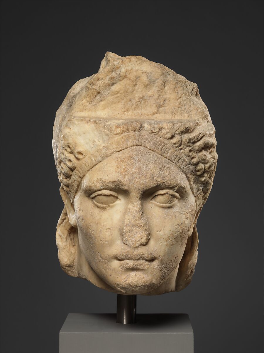 This imposing head probably comes from a statue of Sabina, wife of the emperor Hadrian. The face was originally surmounted by a very high, ovoid hairpiece covered with small curls, a style that was fashionable at the court of Trajan in about A.D. 100.