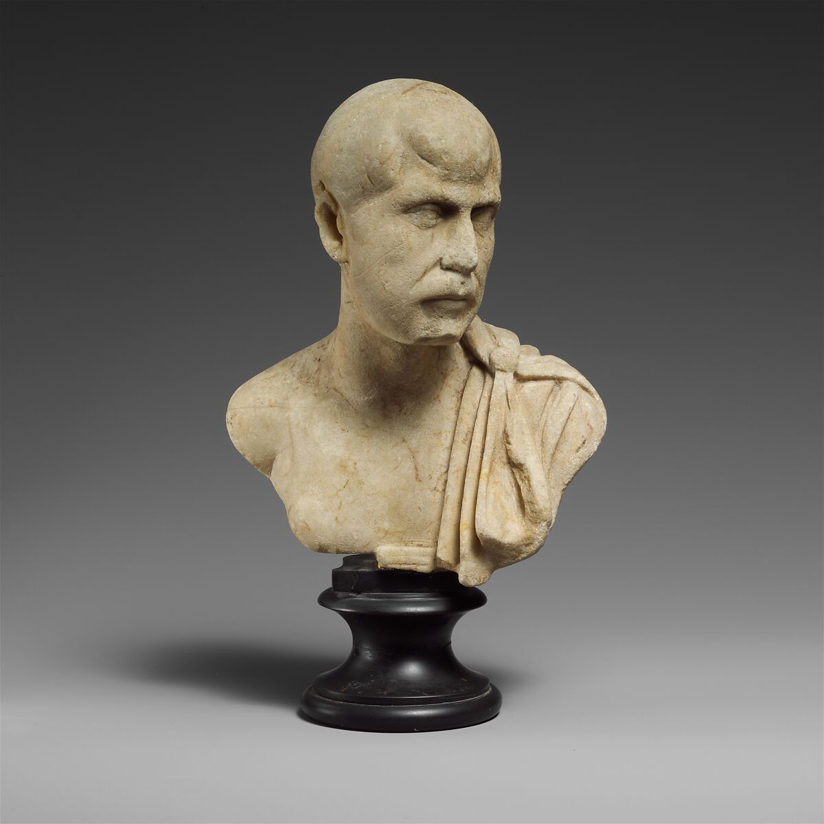 Beardless man with cloak on left shoulder. The barely articulated hairstyle is divided into three sections but is finished solely at the edges.