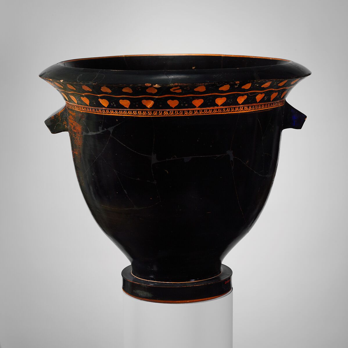 In this magnificent vase, the shape and the gloss of its surface are paramount. The lack of figural decoration suggests that, rather than hold wine, it may have contained cold water or snow to chill a wine-filled psykter (vase for cooling wine).