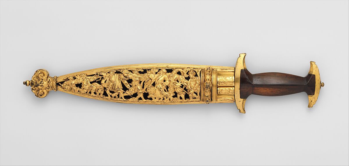 Daggers with I-shaped grips were known as baselards, after the city of Basel, and were considered a national arm of the Swiss. Splendidly decorated specimens such as this one, with elaborate gilt bronze mounts and scabbards, were worn by officers and wealthy burghers, who usually also held high-ranking positions in the militia. The figural decoration on the scabbard represents the story of William Tell, the Swiss national hero.