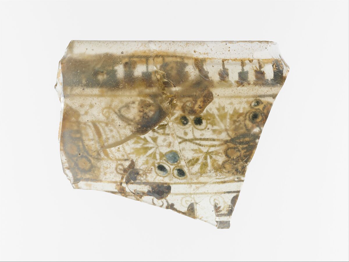 Broken and repaired from three pieces, with jagged edges at sides and bottom; pinprick bubbles; dulling, slight pitting, and faint iridescence.