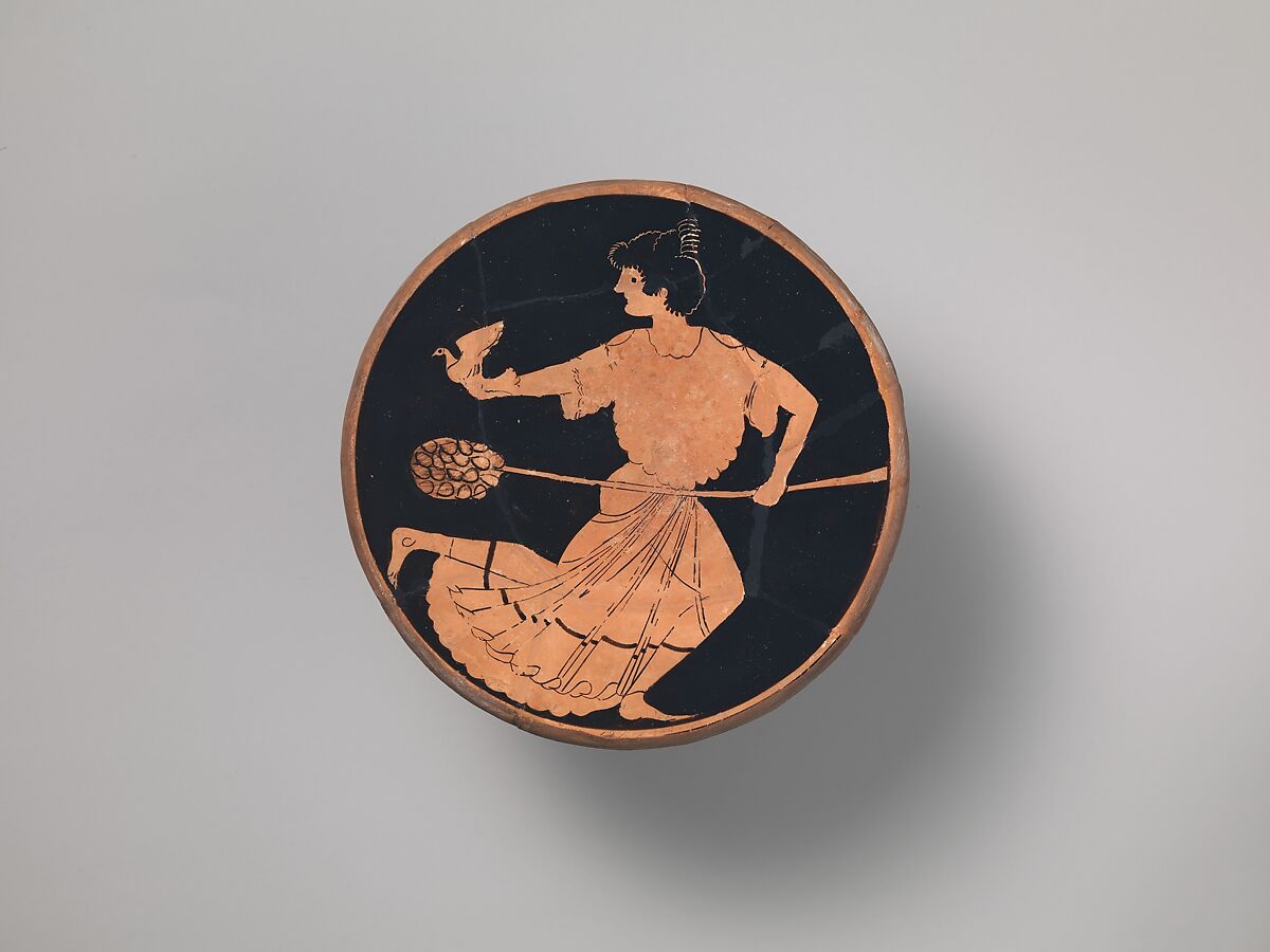Like the cup by the Kiss Painter (07.286.50), this work was shaved down in antiquity. The iconography is interesting because maenads (female followers of Dionysos, the god of wine) are not commonly associated with birds. She seems to be letting a dove fly, much as Athena releases her owl.
