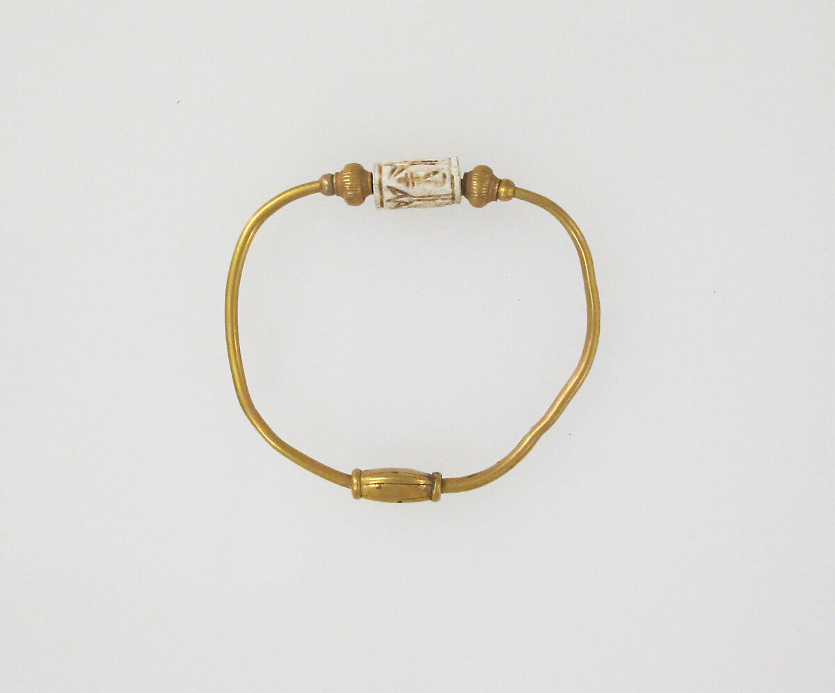 Bracelet with lotus flowers and Nefer signs; rhombic bead form opposite cylinder with 2 fluted beads at ends.