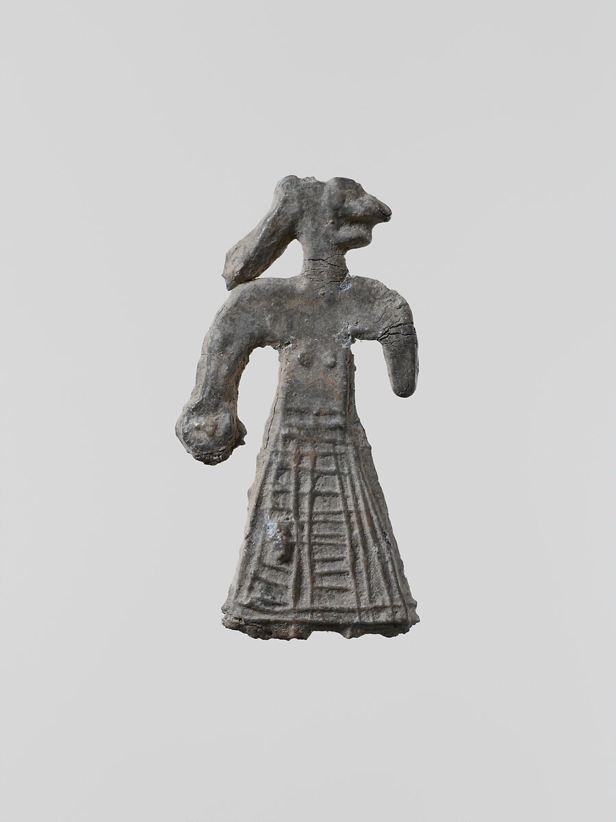 Small flat votive figurines of cast lead have been found in great quantities at the ancient sanctuaries of Laconia; over one hundred thousand, dating from the seventh century B.C. to the Classical period, were dedicated to the goddess Artemis Orthia in Sparta.