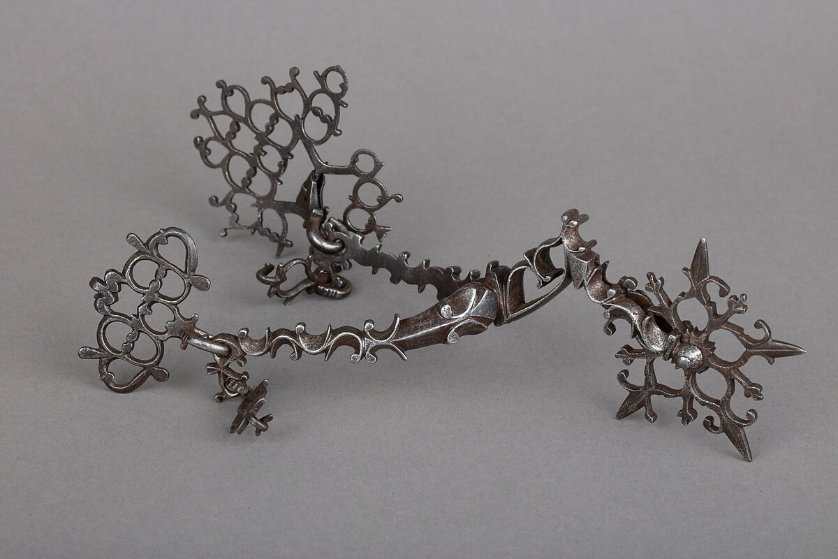 This pierced and chiseled decoration is inspired from contemporary German examples, but the style, more floral, betrays a likely Spanish origin. In the first half of the 17th century, the fashion trend for gentlemen in Europe was to wear boots and spurs even in non-riding circumstances, including for dancing or walking around at court. Spurs became then more than equestrian tools, but pieces of male jewelry often enriched by the same goldsmiths also working on armor and weapons. Their decoration was sometimes intended to match the sword hilt and the general outfit and horse tack of their owner. These trendy accessories were also a significant mark of status for gentlemen, sometimes nonetheless copied by the bourgeoisie. This fashion progressively disappeared after the mid 17th century