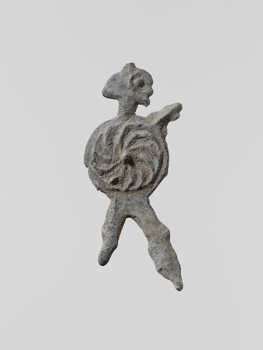 Small flat votive figurines of cast lead have been found in great quantities at the ancient sanctuaries of Laconia; over one hundred thousand, dating from the seventh century B.C. to the Classical period, were dedicated to the goddess Artemis Orthia in Sparta.
