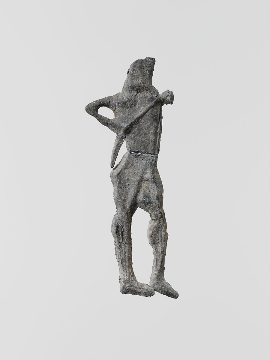 Small flat votive figurines of cast lead have been found in great quantities at the ancient sanctuaries of Laconia; over one hundred thousand, dating from the seventh century B.C. to the Classical period, were dedicated to the goddess Artemis Orthia in Sparta.