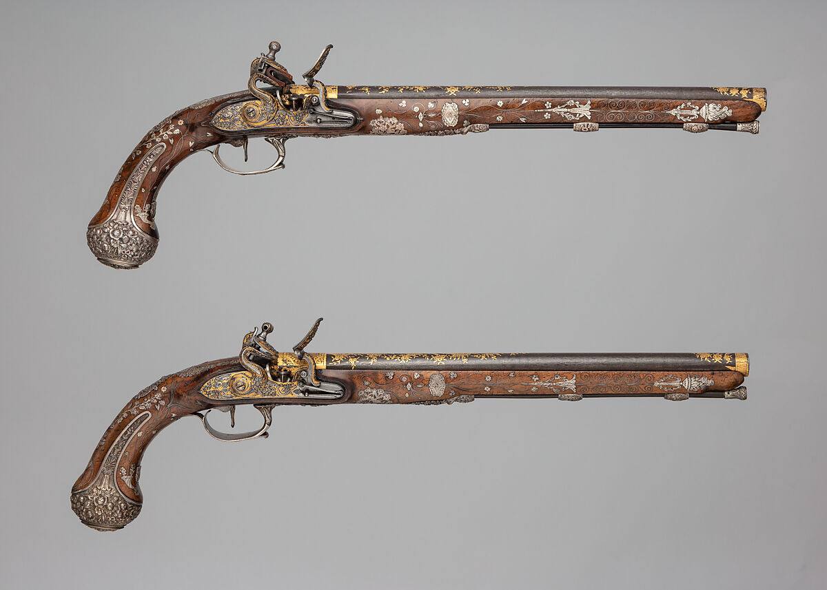 There are four Paris silver marks on this pair of pistols’ cast silver mounts, all of which date from the period 1809-19. The unidentified maker’s mark (in a lozenge the initials LB flanking a cross-like device), which may be that of L. B. Beaugeois, a jeweler recorded at 11 rue Chabanais, Pairs, whose mark is registered in 1810-11, also appears on several gold mounts of the Museum’s fowling piece by Nicolas Noël Boutet (Acc. No. 42.50.7). The mounts of the pistols and fowling piece share in common heavy, space-filling floral and scroll ornament, and both have stocks combining inlays of metal foil and wire. The style of both the pistols and fowling piece, in absence of specific Empire motifs, suggests the period of restoration of the monarchy in France following the fall of Napoleon in 1815. The shape of the pistols’ butts returns to the more traditional eighteenth-century style, probably a conscious rejection of the squared butts found on pistols made during the Empire (for example, Acc. No. 28.196.1a, b, .2a–l), and a reaffirmation of a style identifiable with the Ancien Regime.