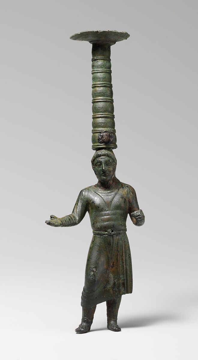 This fragmentary bronze originally belonged to the shaft of an incense burner similar to the more complete examples in this case (97.22.22 and 1992.262). During the fifth century B.C., the Etruscans were expanding their trade contacts throughout the Mediterranean world. The man in Persian costume is an unusual expression of the Etruscan interest in the exotic.