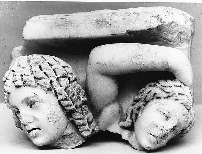 - Title: Upper right corner of a marble sarcophagus: head of a Black African and a maenad