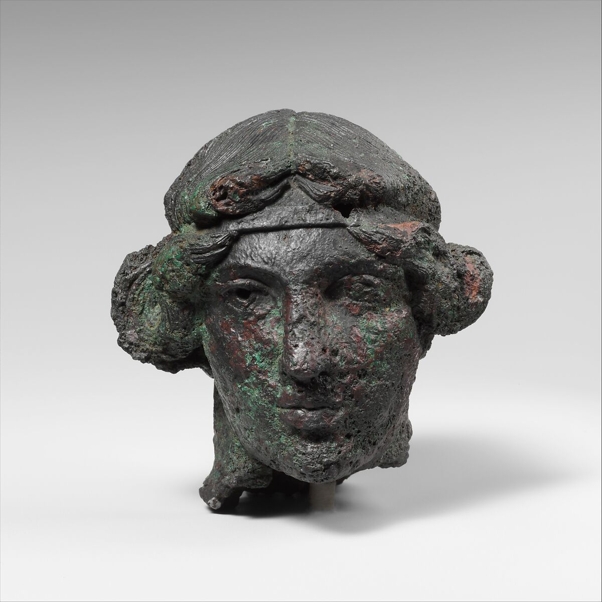 This head entered the collections of The Metropolitan Museum of Art attached to the statuette of a man, 29.48a. Although the surface of the two pieces is comparable, the head is larger in scale and quite different in style. It shows a young man with a full head of hair pulled up and held in place with a band. The square hole on the back of the neck was probably for the attachment of the pony tail that was worn up. While the figure has been identified as Dionysos, it may well be another divinity, such as Apollo, or an athletic mortal.