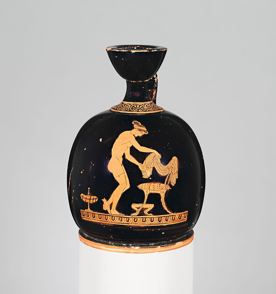 This charming, intimate vignette shows a woman who has already done her hair and put on a necklace and thigh band. Behind her stands a large plemochoe, a vase for scented oil. She lifts her chiton from the chair, which is provided with a pillow and, in the background, a footstool.