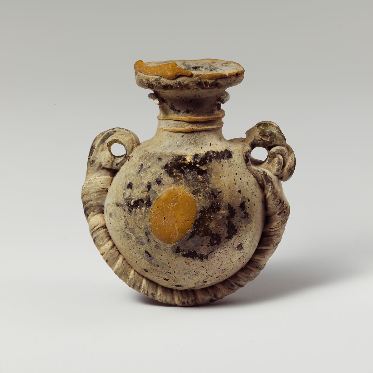 Together with the other two similar aryballoi displayed here (91.1.1367 and 17.194.309), this bottle belongs to a small group of core-formed glass that may have been made in southern Italy, Sicily, or even Carthage. It has also been suggested that these bottles may have been worn as amuletic pendants around the neck.