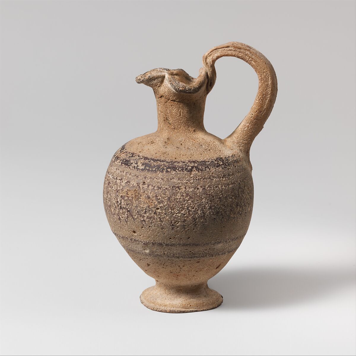 Applied trefoil rim-disk; rather tall cylindrical neck, tapering slightly downwards; angular shoulder; ovoid body; applied outsplayed foot with uneven concave bottom; handle attached to top of body over trail decoration, drawn up and out,arching above rim-disk, then turned in and pressed on to back of rim-disk and top of neck.