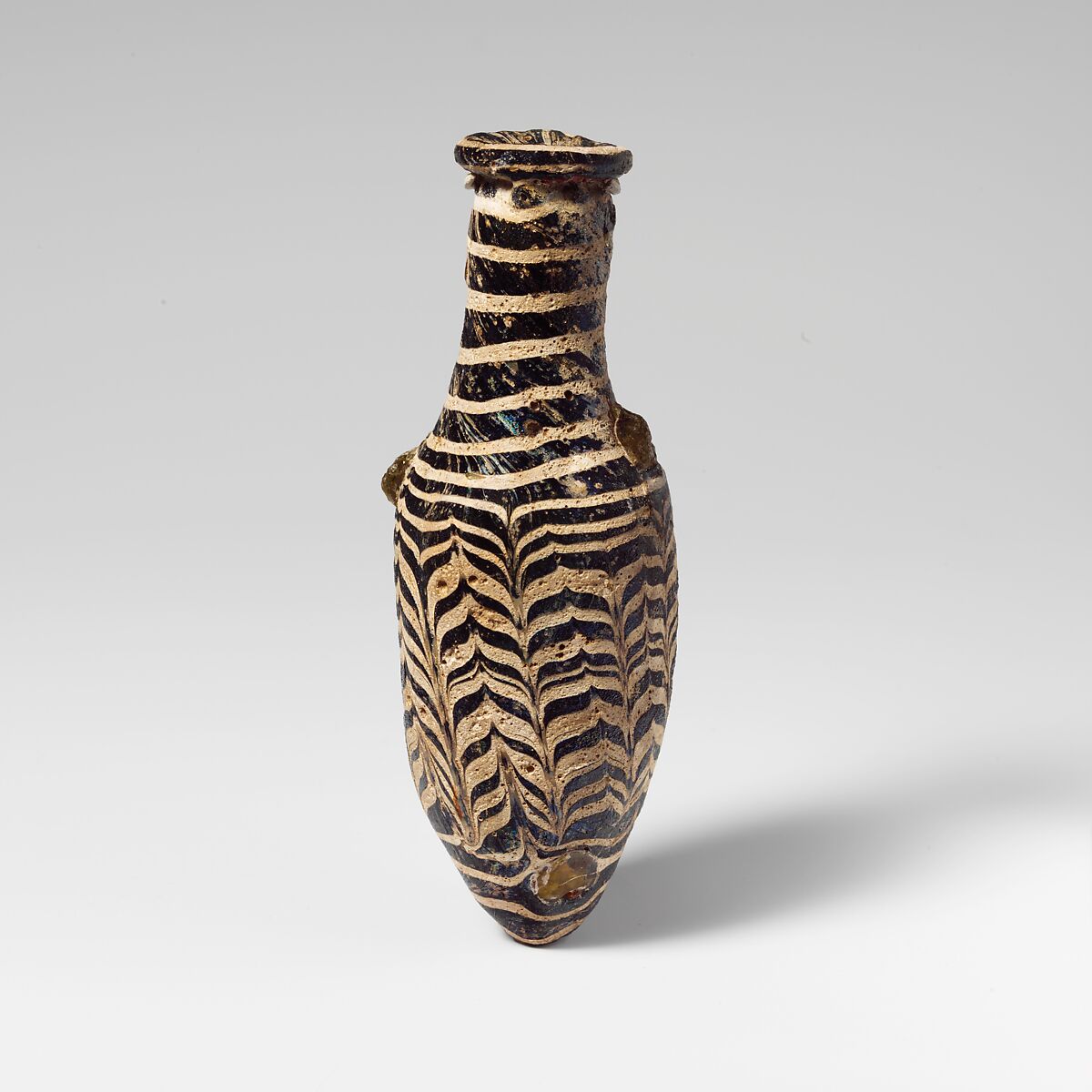Uneven, slanting rim-disk, with thick rounded edge and sloping inward; thick cylindrical neck, with tooling indents around top; narrow angular shoulder; elongated ovoid body; pointed bottom; vestiges of two vertical handles applied in pads at different heights on shoulder, trailed up neck, and pressed on to top neck; a marvered blob of translucent greenish yellow glass applied over trail on lower body.