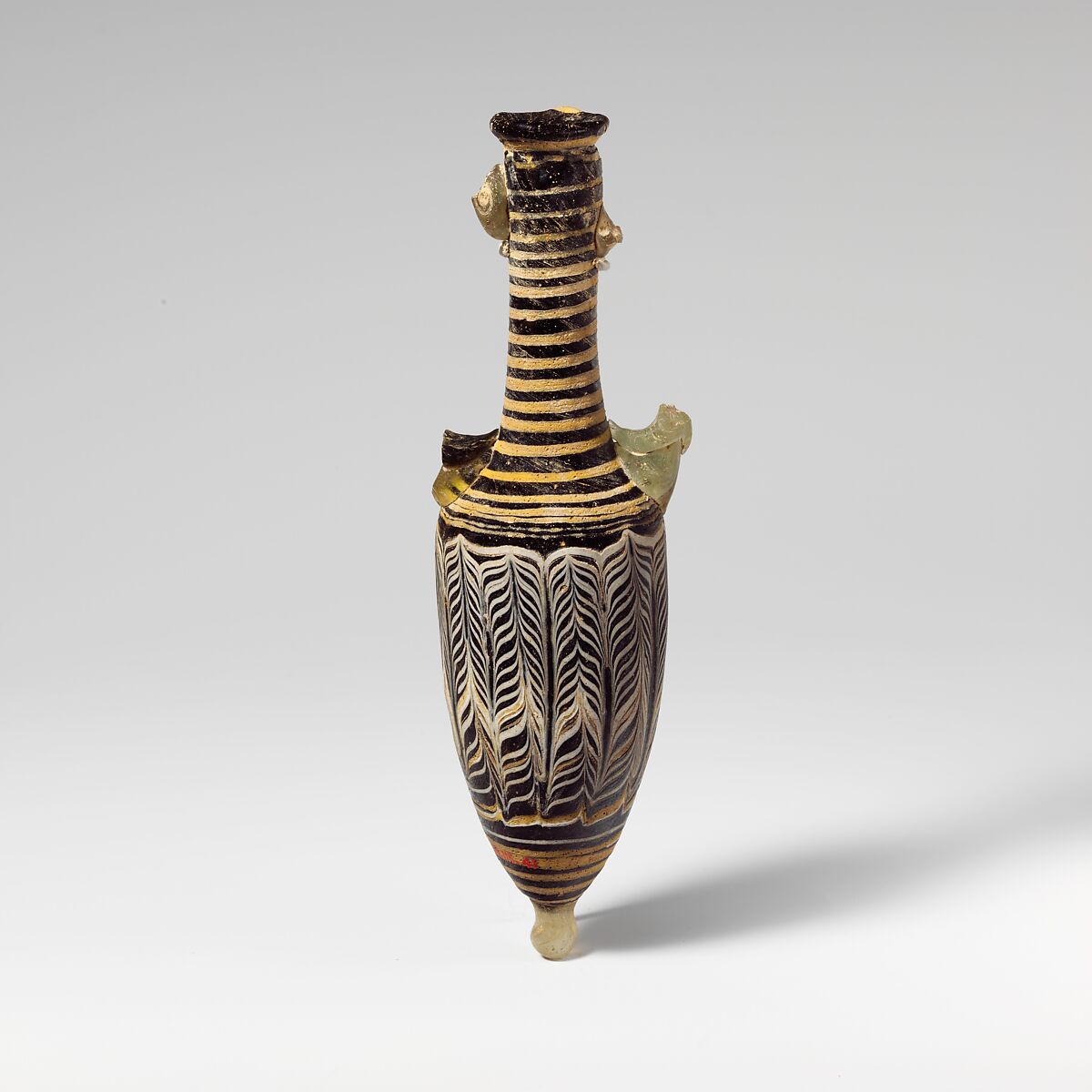 Uneven rim-disk, with rounded edge and sloping inward; tall, slender cylindrical neck, with tooling indents around top; narrow sloping shoulder; elongated, narrow ovoid body; pointed bottom with applied base-knob; two vertical handles applied with separate pads on shoulder, and pressed on to upper neck.
